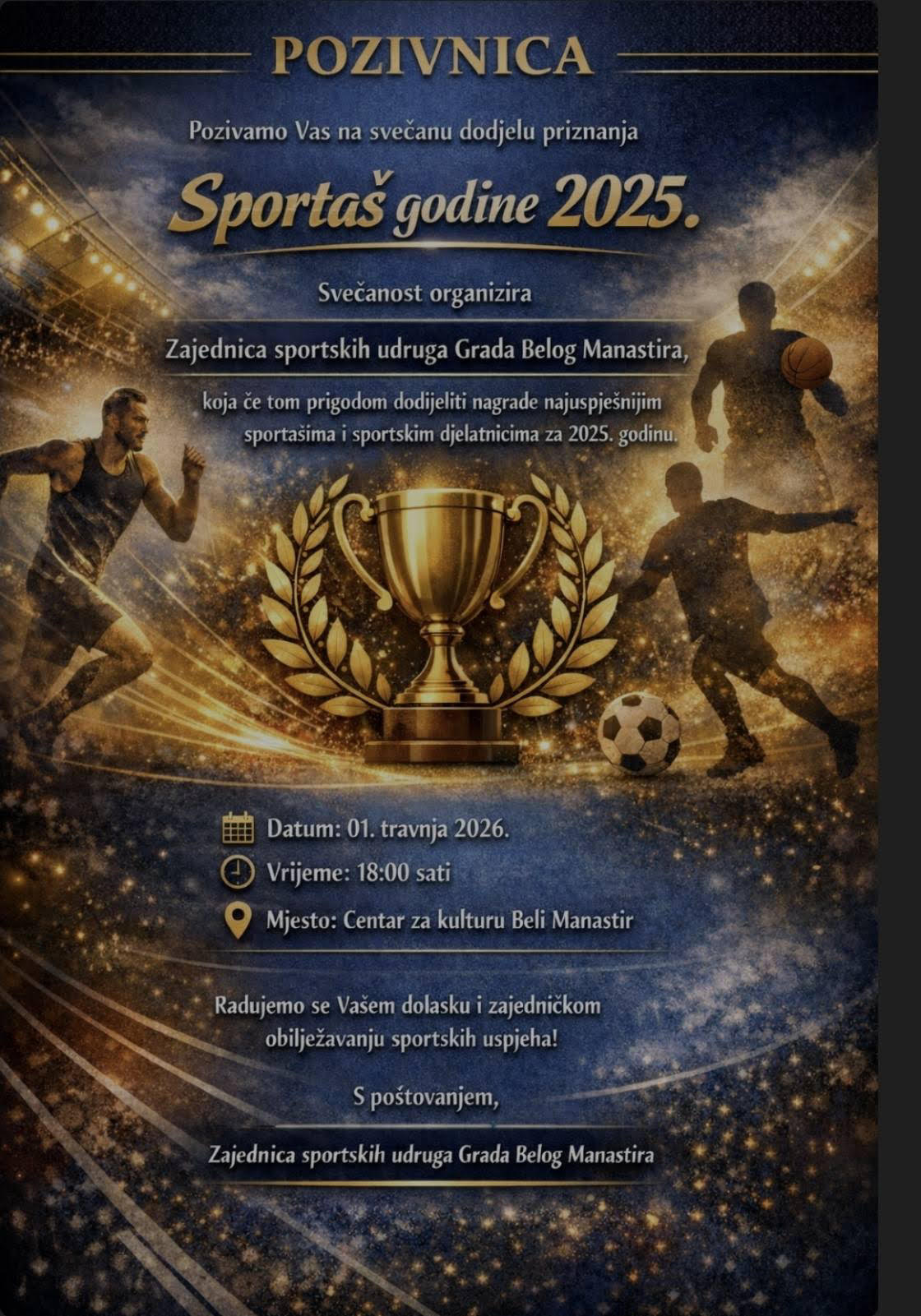 ZAJEDNICA ŠPORTSKIH UDRUGA GRADA BELOG MANASTIRA Školska 3, Tel. 031 700 454 OIB 91269176393 https://zsubm.hr/ e-mail: zajednica.bm@post.t-com.hr Zajednica športskih udruga grada Belog Manastira, osnovana sukladno Zakonu o sportu i Zakonu o udrugama Republike Hrvatske, krovna je organizacija u sustavu športa na području Grada Belog Manastira. Zajednica pruža športskim udrugama s područja Grada Belog Manastira, svu… Nastavi čitati POZIV NA AKTIVNO SUDJELOVANJE U SPORTSKO – REKREACIJSKIM AKTIVNOSTIMA KOJE PROVODE ŠPORTSKE UDRUGE GRADA BELOG MANASTIRA